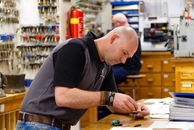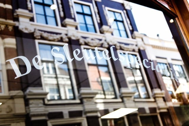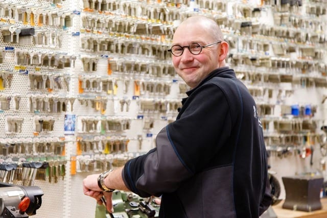 In de winkel van De Sleutelspecialist hangen wel honderdduizend sleutels aan de muur. Ze zijn verkrijgbaar in tienduizend verschillende soorten en maten. ‘Ik heb ze nog nooit geteld’, lacht Sebastiaan Rauwerda. De olijke eigenaar houdt wel van een grapje. ‘Maar ik schat in dat het aantal wel klopt. Sebastiaan legt uit wat hij en zijn collega doen met de sleutels en wat hun taken zijn in de winkel. ‘We maken sleutels en geven advies over sloten, sleutels en kluizen. Daarnaast hebben wij nog een buitendienst voor het beveiligen van woningen en bedrijven, plaatsen we elektronische cilinders en deurautomaten en we openen en repareren deuren.’