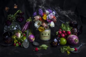 De creativiteit, het beeldend denken en het praktisch werken is er altijd geweest. Vandaag de dag zet ze dat om in bijzondere, eigenzinnige en ietwat surrealistische beelden. Haar kunstwerken komen voort uit hersenspinsels of een droom. ‘Mijn hoofd zit altijd vol. Ik ben een erg actieve dromer en die dromen dienen als inspiratie voor nieuw werk. De hele dag loop ik met ideeën rond en ben ik druk in mijn hoofd; en ja, dat moet eruit. Verder ga ik vaak zonder plan aan de slag. Ik heb een sfeer of een setting in mij hoofd. Dat is dan mijn basis.’ Het komt dus vooral aan op spontaniteit en creativiteit. ‘Het moet zwoel zijn, ik beeld mij een jungle in en dan rolt er vanzelf een beeld uit.’ Het begint bij het maken van de foto. Dat kan een portret zijn, een stilleven of een landschap. Wanneer ze de juiste foto heeft gemaakt, begint het bewerken en komt het idee pas echt tot leven. Ze gaat sfeergericht te werk. Het is vooral veel uitproberen om haar visie in het kunstwerk te krijgen. ‘Ik ben vaak in de wolken, om het zo maar te zeggen. Het is wat wazig, maar het is een element dat met regelmaat in mijn werk terugkomt.’ De betekenis van haar werk laat ze in het midden. Het is maar net wat jij er in ziet of er bij voelt. Het zijn werken die balanceren op de grens van realisme en surrealisme. Even later hebben we het erover hoe tof het zou zijn als je daadwerkelijk dromen kunt vangen, op die manier de beelden uit je hoofd haalt en zo wat meer rust creëert. ‘Dat zou nog eens een uitvinding zijn,’ beaamt Maaike.