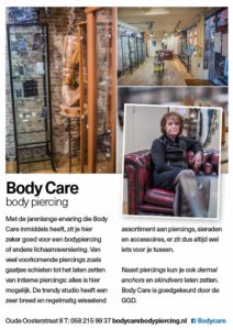 Op de Oude Oosterstraat 8 vind je Body Care. Een gezellig en professionele piercingshop waar je terecht kan voor een breed assortiment aan piercings, sieraden en andere accessoires. Breng er gerust eens een bezoekje en laat je verrassen door de veelzijdigheid van bodypiercen!
