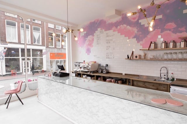 De nieuwste hotspot in Leeuwarden, with a lot of pink and pretty food. De grote ramen in dit schattige pand op de Kelders wekken de nieuwsgierigheid op om ook eventjes naar binnen te kijken. Het marmer van de bar en tafeltjes, de roze velvet meubels en de sprookjesachtige muurbeschildering doen het ook daadwerkelijk voelen alsof je even naar een andere wereld wordt meegenomen. Om nog niet eens te spreken over de kleurrijke bloemen bij de ingang waar je al vrolijk van wordt nog vóór je een stap naar binnen hebt gezet!