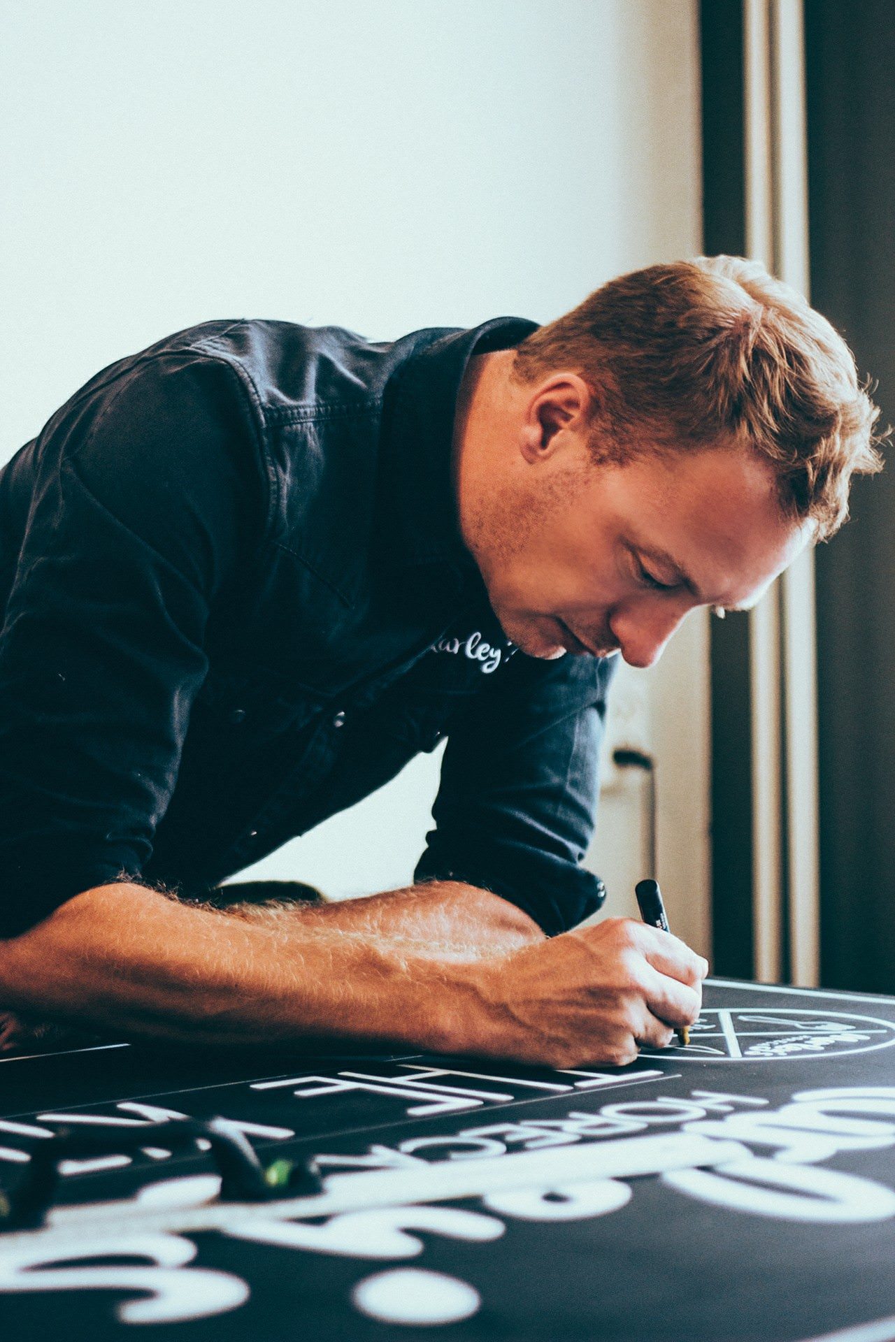 Meer dan krijttekeningen Van jongs af aan is Jelmer al bezig met vormgeving en design. Tijdens zijn studie raakt Jelmer besmet met het horecavirus. Inmiddels is hij al zo’n 20 jaar werkzaam in het vakgebied. Met Marley’s biedt hij met zijn ervaringen en eigenzinnige visie een helpende hand aan iedereen die met horecavragen zit. ‘Vaak hebben we een adviserende rol, maar we doen ook catering, geven trainingen aan beginnende bedrijven en organiseren horeca-events. Maar de meeste tijd zit toch in chalkdesign. Horeca is veelzijdig en alle aspecten zijn geweldig om te doen, maar toegegeven: het ontwerpen en uitvoeren van chalkdesigns vind ik toch het allerleukste.’ Sfeermaker ‘Wat je nu heel veel ziet, ook in het buitenland, is die rauwe, urban look. Veel industriële en natuurlijke elementen. Daar passen krijtborden natuurlijk perfect bij. Met typografie kun je al veel doen qua sfeer. Elk lettertype heeft weer zijn eigen stijl. Strak, speels, stoer, zakelijk: maar net wat je wilt uitstralen. Daarnaast kun je het met afbeeldingen helemaal aanpassen in de stijl die je wilt. Zo kun je gemakkelijk, zonder grote verbouwing, een andere sfeer creëren.