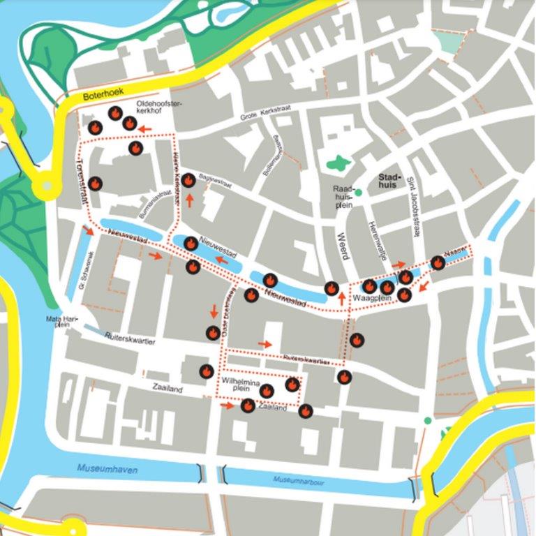 Op het kaartje hieronder kun je precies zien waar je langs moet lopen om niets te missen van het spektakel. De hoogtepunten van de route bevinden zich op het Oldehoofsterkerkhof en op het Wilhelminaplein; hier zie je ook veel vlammetjes bij elkaar. Ook heel fijn, de toegang is gratis. Dus kom jij ook?
