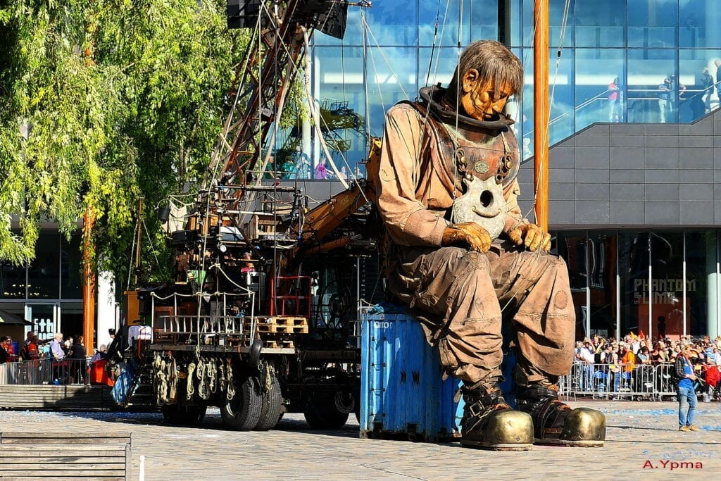 Een jaar geleden was er een reusachtig groot evenement in Leeuwarden: de reuzen van het Franse theatergezelschap Royal de Luxe. Drie metershoge marionetten, een duiker, een meisje en de hond Xolo, wandelden door de straten van Leeuwarden en werden door tienduizenden mensen bekeken.