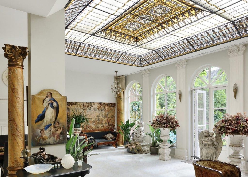 “We hebben de winkel al 35 jaar. Bij een van de inkoopreizen, tweeëntwintig jaar geleden, kwamen we dit plafond tegen. Het hing in België bij een handelaar in antiekbouwmateriaal. We hebben er een uur onder gestaan, elkaar aangekeken en we zeiden als we dit niet doen, dan zullen we daar ons hele leven spijt van hebben. Dus binnen een uur beslist en gekocht. En nooit een dag er spijt van gehad.”