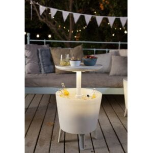 Partytafel, koelbox, koffietafel en tuinverlichting in één. Deze multifunctionele tafel is ideaal voor de zomer. De koelbox heeft een inhoud van 30 liter, genoeg voor 25 flesjes bier. Je kan de tafel dicht houden zodat het een lage koffietafel is, schuif je de bovenkant open dan heb je een partytafel met meteen toegang tot het koelelement. Met de LED verlichting kan je tuinfeest ook nog doorgaan als het donker wordt.