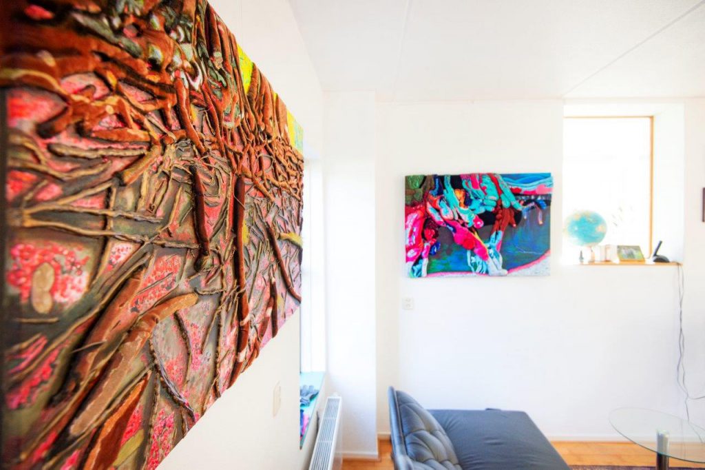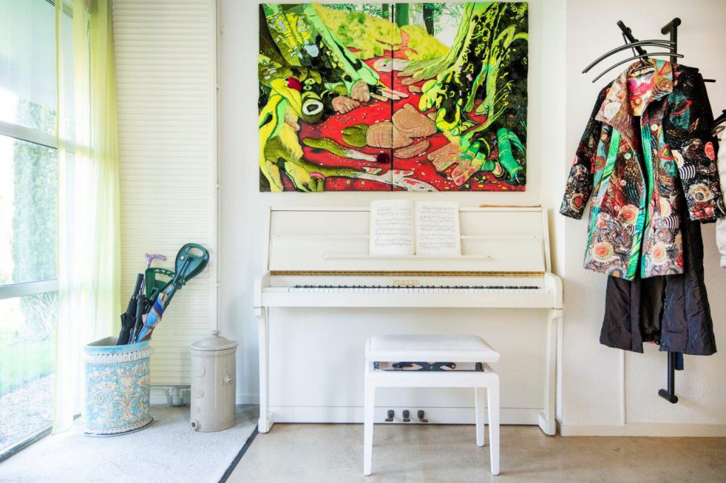 Marian is kunstenaar. Dat is in huis te zien aan het grote aantal kunstwerken van haar hand. Ook hangt aan de muur een kunstwerk dat ontstaan is samen met een kunstenares uit Zuid-Afrika. Marian zegt: “Het kunstenaarschap biedt veel mogelijkheden, zoals artist residencies in Nieuw-Zeeland en Frankrijk.” Zo heeft ze afgelopen jaar voor een oude kerk in Frankrijk een ‘Jakobsladder’ ontworpen en gemaakt.
