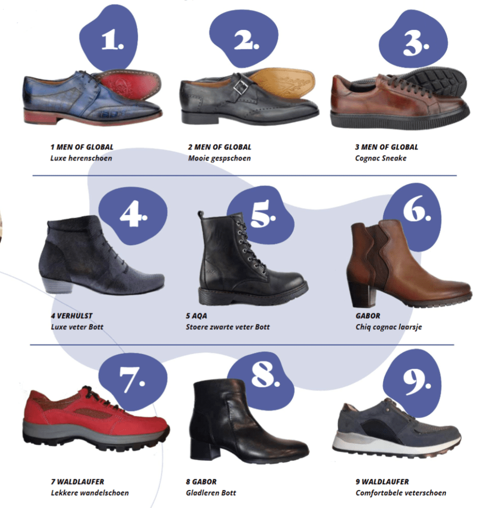 Hieronder hebben we een aantal schoenen op een rijtje gezet. Meer zien? Kom dan eens langs aan de Wirdumerdijk!