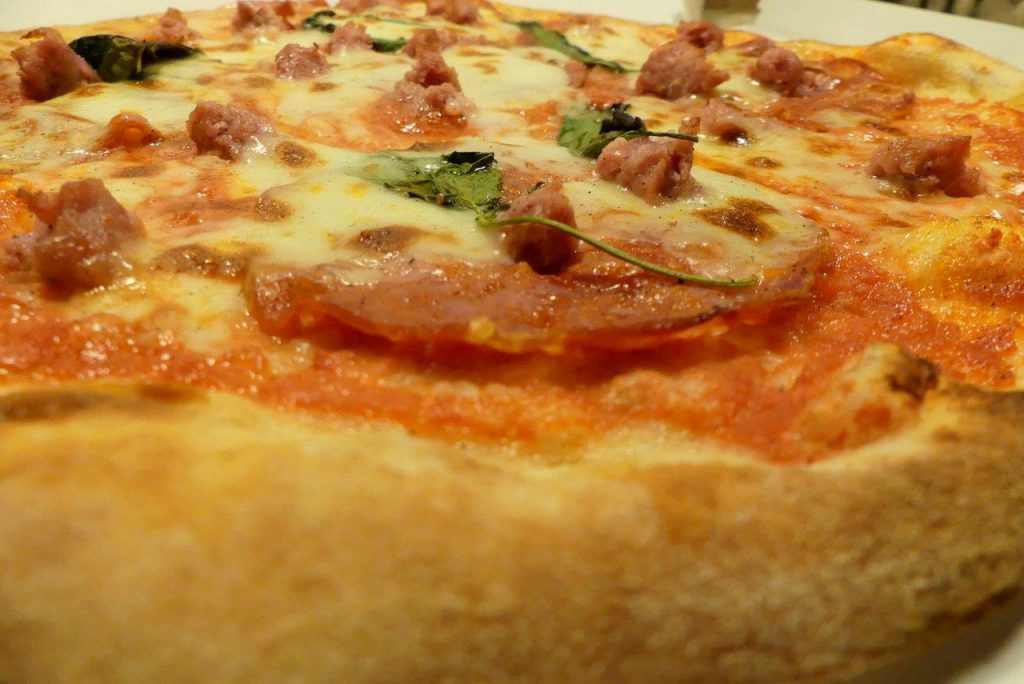 De pizza is belegd met pittige salami en een specifieke Italiaans venkelworst specialiteit. Pittig, vol met smaak. Hier hou ik van. De pittigheid combineert heerlijk met de romige smaak van de mozzarella. Zeer geschikt voor mensen die houden van een pepertje.
