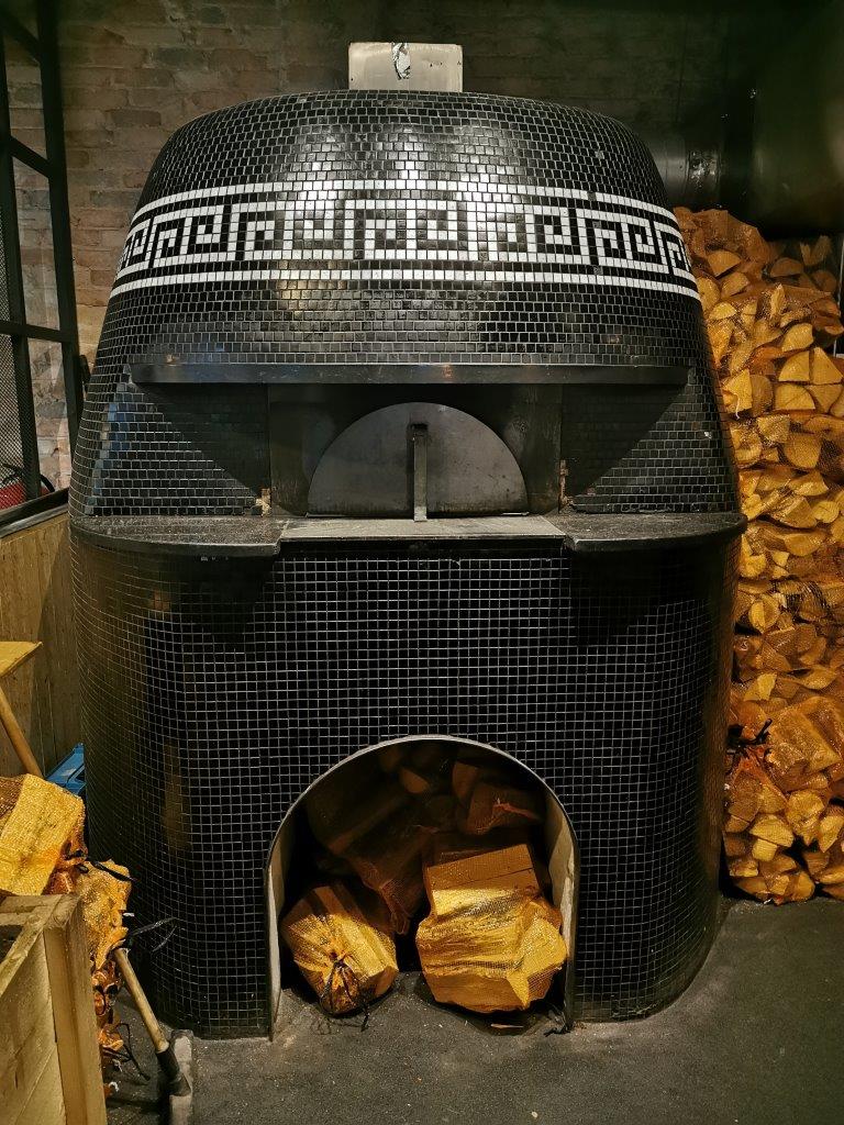 “Jazeker”, vertelt Peter trots, “de oven is ín het pand gebouwd. Deze is steen voor steen in twee weken opgebouwd. Daarna is de sierbetegeling er op gekomen. Je stookt hem op hout tot minimaal 400 graden, je ziet de voorraad er naast liggen. Deze oven en deze temperatuur heb je nodig voor dit type pizza.”