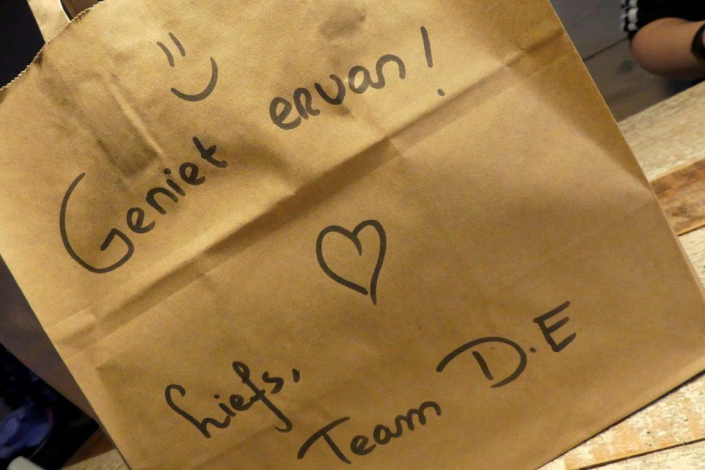“Mensen bestellen ook veel voor elkaar op moment, dat is hartverwarmend om te zien. Dan zetten we de tekst op het tasje. Zo zien we kleinkinderen die opa en oma verrassen met een ontbijtje of iemand die wat lekkers naar al haar collega’s stuurde. Echt leuk om te zien.”