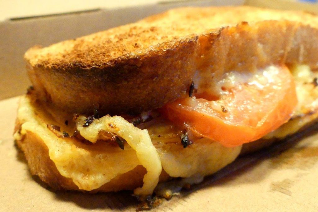 Grilled Sandwich kiprollade – Een warm broodje, een soort royale tosti, gevuld met kip, kaas en tomaat. Een absolute topper, geserveerd met een rode saus, een soort mengvorm van bbq-saus, chili saus en curry.