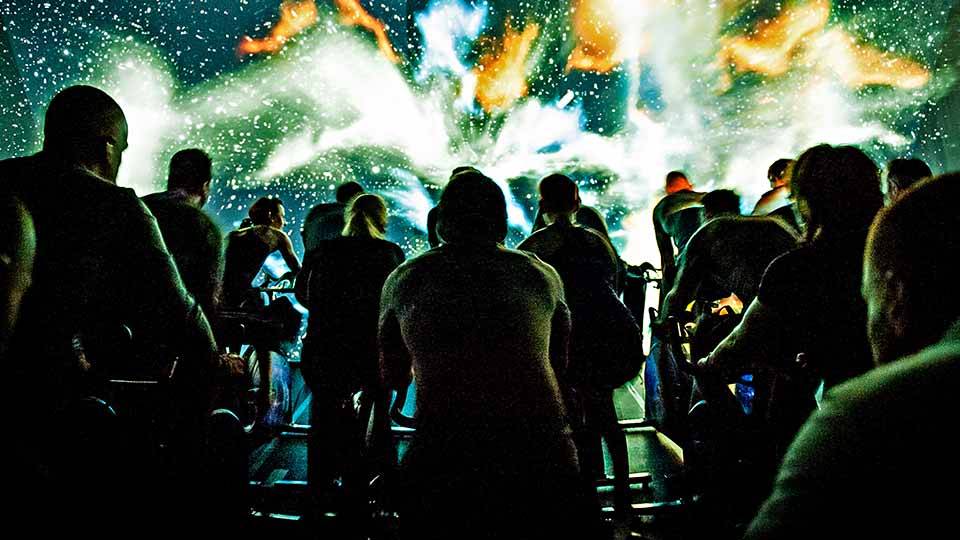 Of wat dacht je va een digitale wielerbaan, om vervolgens met een ondergaande zon verder te fietsen? Alle werelden worden geprojecteerd op een scherm van tien meter breed en drie meter hoog.