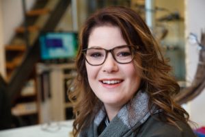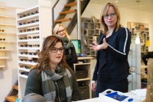 ‘Nadat we de ogen van Madelon hebben opgemeten, werd het tijd om een passend montuur te vinden. Bij het uitzoeken van een montuur doen we altijd eerst een kleur- en gezichtsanalyse. Hierbij wordt gekeken welke kleur en welke vorm bril bij het gezicht past. Uit de analyse van Madelon kwam naar voren dat warme kleuren het best bij haar passen. Gezamenlijk hebben we gekozen voor een bruin montuur van Calvin Klein. Een montuur dat in alle opzichten past bij de ‘nieuwe’ Madelon!’