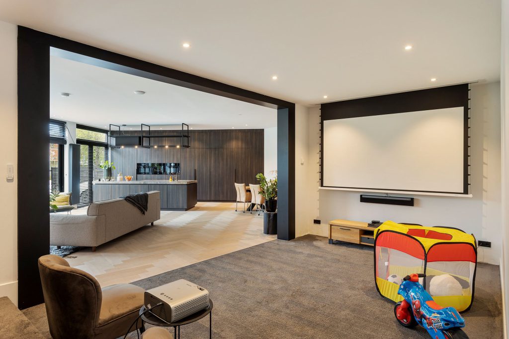 We zijn nog niet uitgekeken op de begane grond: er is ook nog een bioscool-/speelruimte (van ongeveer dertig vierkante meter) en een bijkeuken met een wasmachineaansluiting. Achter de keuken is een 'verborgen' bergruimte/achter-entree met deur naar de parkeerplaats en tuin.