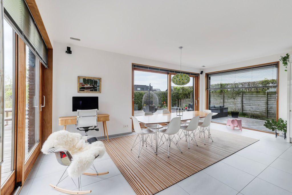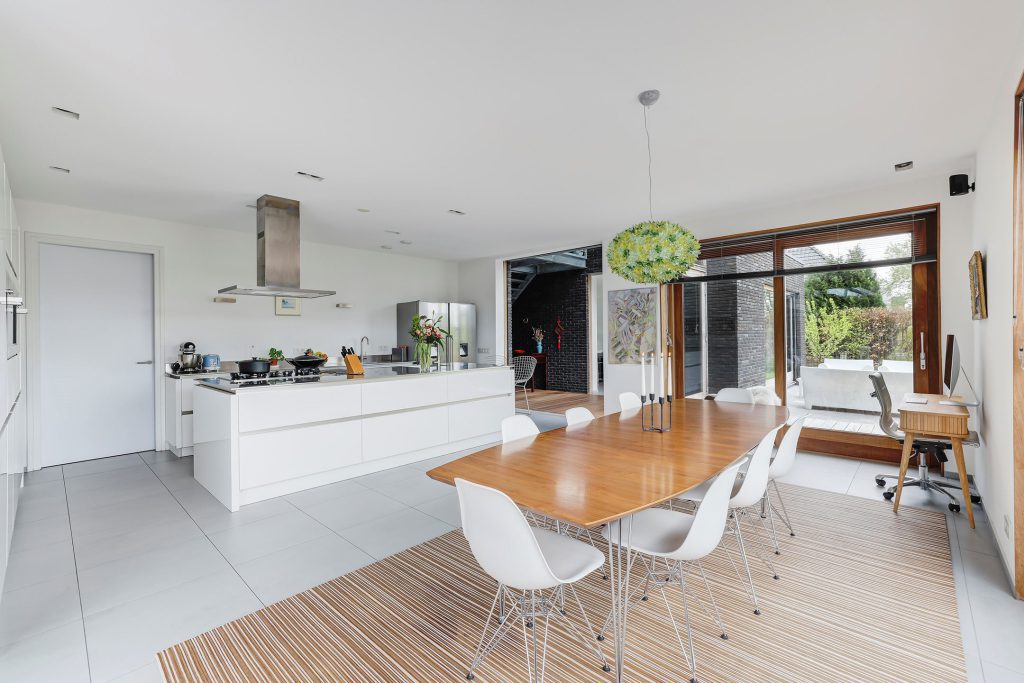 Het huis zelf heeft grote schuifdeuren en grote ramen. De woonkeuken heeft een groot kookeiland met vaatwasser, koel-/vriescombinatie, een stoom-, bak- en combioven en een gaskookplaat. De ruime bijkeuken heeft nog een deur naar buiten en naar de garage. En daarnaast heeft de benedenverdieping ook nog eens vloerverwarming.