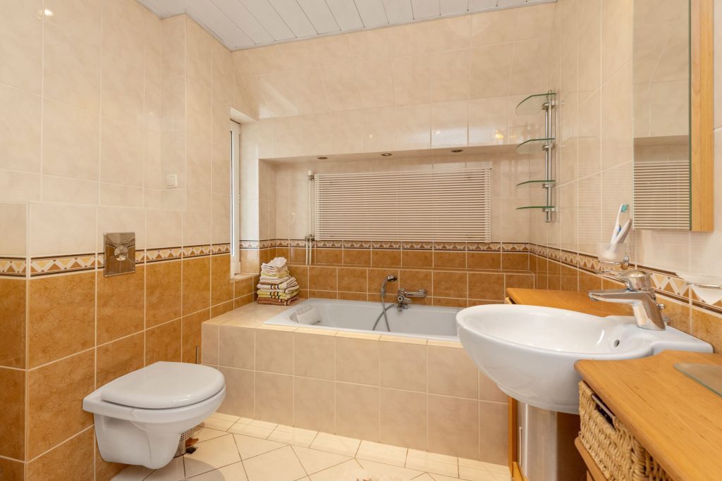 Op de eerste verdieping vind je een ruime overloop met toegang tot de badkamer, drie slaapkamers en een hobbykamer. De volledig betegelde badkamer is voorzien van een ligbad, toilet en douche. De slaapkamer aan de achterzijde van de woning, welke zich naar de badkamer bevindt, beschikt over een vaste kast, wastafel en balkon.