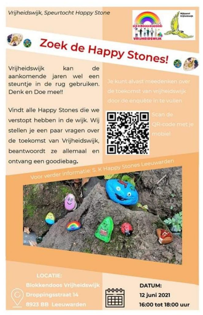 Morgen is er van 16:00 tot 18:00 een Happy Stone Speurtocht in de Vrijheidswijk in Leeuwarden. De locatie hiervan is Droppingstraat 14. Tijdens deze speurtocht ga je opzoek naar alle verstopte Happy Stones. Ondertussen worden je een aantal vragen gesteld over de toekomst van de vrijheidswijk. Als je deze allemaal beantwoord, ontvang je een goodiebag!