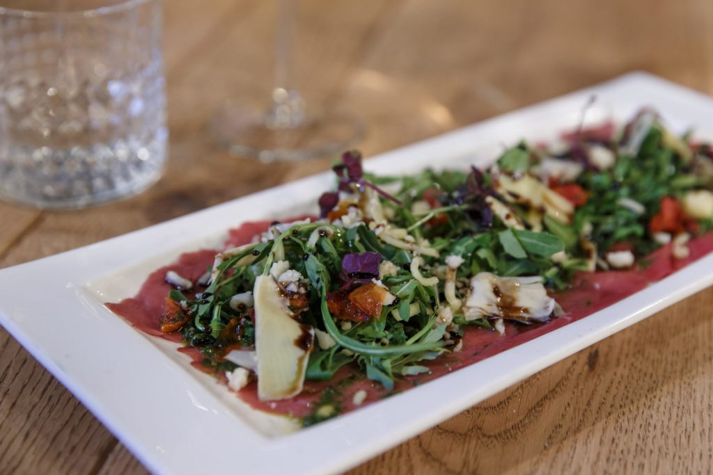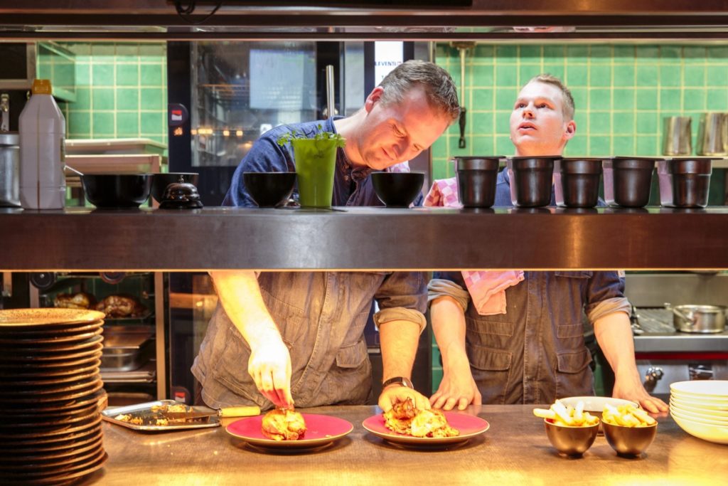 Elke week neem ik mijzelf voor te minderen met vlees en alcohol. Het eerste voornemen gaat vijf van de zeven dagen goed, en bij dat tweede struikel ik meestal al halverwege de week. En aangezien het nu woensdag is besluit ik een heerlijk glas witte Rock ’n Roll Classic te bestellen bij een volledig vegetarisch menu. De keuze aan vegetarische gerechten is niet heel groot; twee voorgerechten, één hoofdgerecht en één maaltijdsalade. Bij de voorgerechten kan ik kiezen uit lasagne van Nori met knolselderij, schorseneer, hazelnoot, citroen en augurk òf kastanje-champignonsoep met sherry cappuccino. En hoewel het weer er zeker naar is en ik gek op Hete Soep ben, ga ik vandaag toch voor het spannendst klinkende gerecht met Japans zeewier. Voor het bestellen vraag ik Sjors, onze gastheer van vanavond, of de jus de veau, die geserveerd wordt bij de kalfsentrecote, bereid is in eigen keuken. Hij vertelt mij enthousiast dat dit zo is; ze bereiden soms wel 60 liter per week van deze uit kalfsbeenderen getrokken jus. Ik sla mijn ogen neer, beslis dat breken van één goed voornemen per diner het maximum is en blijf bij mijn vlees-nochvis- bestelling.