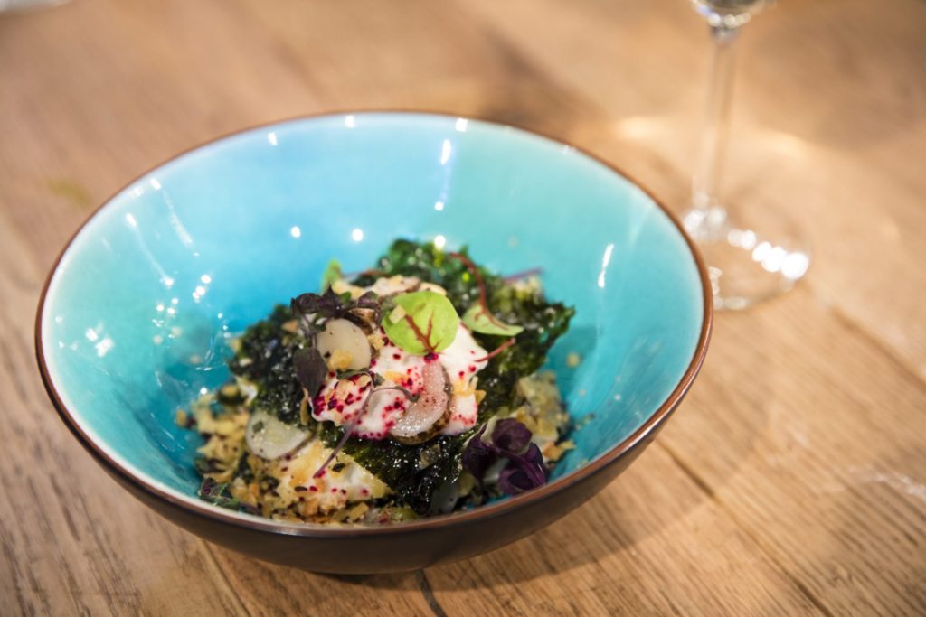 De wijn smaakt goed, het is een blend vertelde Sjors mij eerder. Welke druifsoorten in de mix zitten zijn mij bij het schrijven van dit stuk ontschoten. Maar even googlen en ik krijg een antwoord: de “Rock ’n Roll Classic”- wijn is een beestachtig lekkere blend van muziek, kunst en wijnexpertise. Bij nader inzien dacht ik dat inderdaad te proeven. Dat de keuze aan vegetarische gerechten beperkt is ben ik snel vergeten zodra ik het eerste gerecht gepresenteerd krijg. De smaakvol uitziende laagjes worden geserveerd in een azuurblauw kommetje. Met de smaak van de zee voert door de nori de boventoon, het schuim van knolselderij is luchtig en de schorseneer heeft een lekkere bite. Het knapperige van de hazelnoot en het zuur van de augurk maken het gerecht zoals ik al hoopte positief interessant.