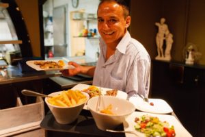 Rhodos Palace heeft veel vaste gasten, sommigen al van de tweede generatie. Niet zo heel gek wanneer je goede gerechten serveert die exact zo smaken als in Griekenland. Eigenaar Sotiris Kontzes legt uit: ‘De kwaliteit van ons eten is zo belangrijk dat wij alleen de beste producten inkopen. Onze authenticiteit behouden we ook door wijnen, olijven en andere ingrediënten uit Griekenland te serveren.’ In de keuken vind je Griekse koks, ze kunnen dus eigenlijk alles wel bereiden. De Griekse keuken draait veel om vlees, maar bevat ook een rijk aanbod aan vis en groenten. Populair zijn de grillgerechten zoals Gyros, Soiuvlaki en Bifteki.Eigenaar Sotiris Kontzes