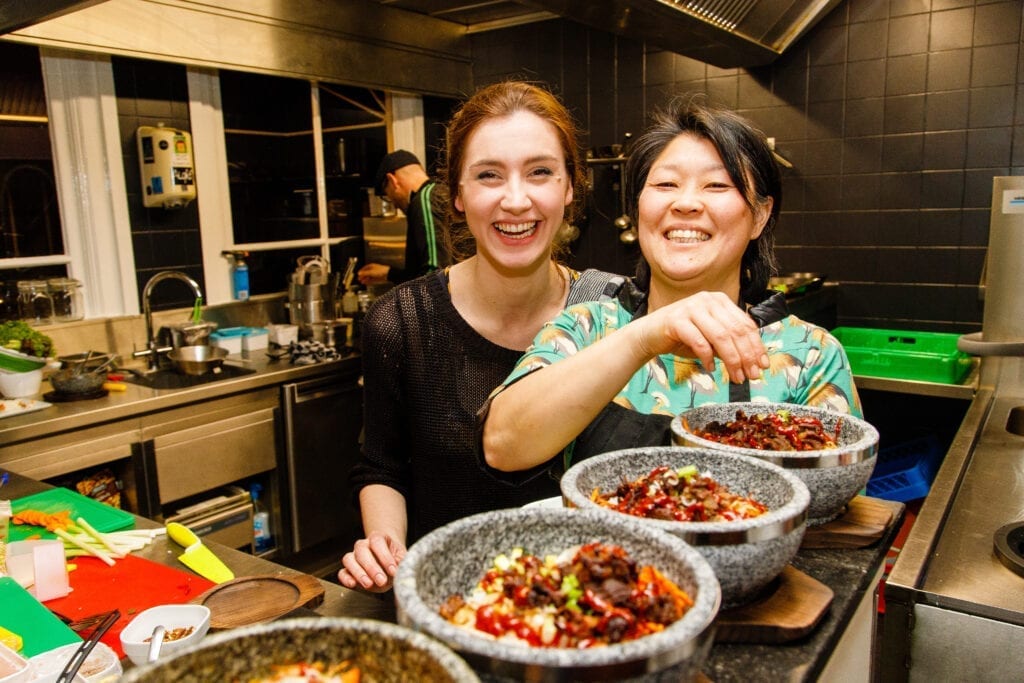 Naast de gezelligheid kom je bij Seoulmates natuurlijk voor het eten. De keuken serveert uitsluitend Koreaanse gerechten: je komt er geen bijgerechten als friet tegen. Verder variëren ze veel met groenten. Resultaat is dat ze bij elk gerecht lekker veel groenten serveren en ze ruime keuze hebben voor mensen die vegetarisch of vegan eten. ‘We proberen ook altijd de drukte te managen en maken liever vers bij dan dat we dingen vooruit maken. Dat proef je, en vers is gewoon lekkerder.’ Dat kunnen we alleen maar beamen.