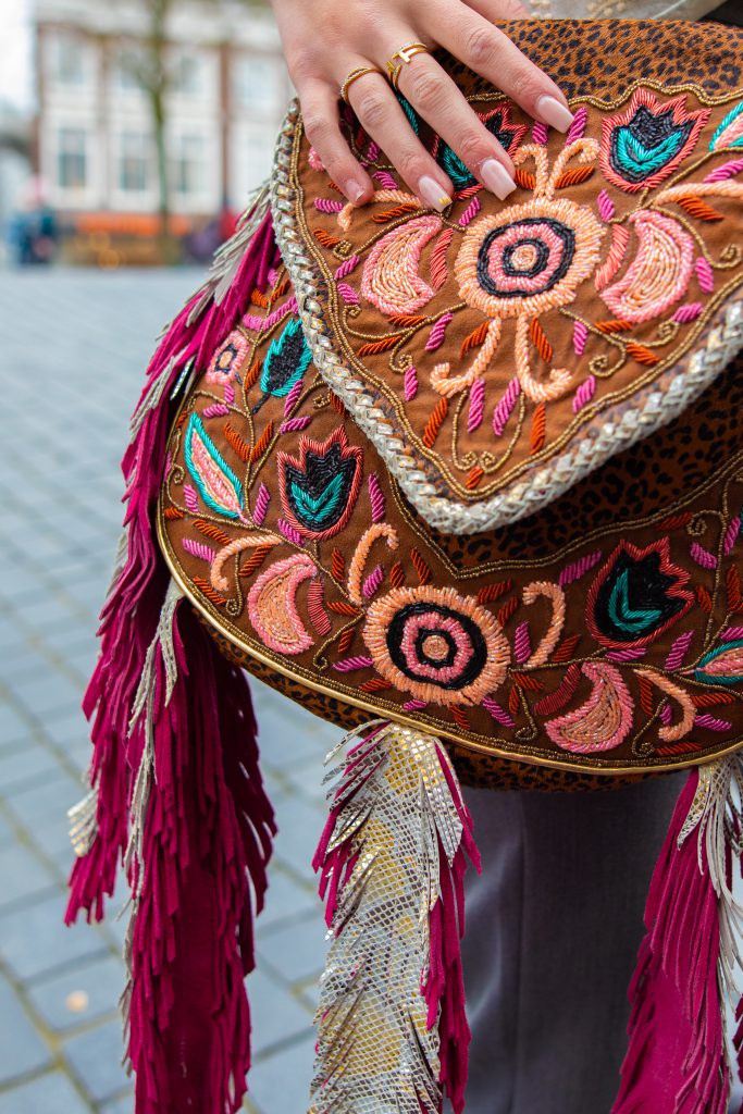 Dit is toch net een klein kunstwerkje? Met de hand gemaakt en perfect passend bij de boho-stijl. Met dit unieke ontwerp en levendige kleuren is het een opvallende toevoeging aan elke outfit, ideaal voor iedereen die zijn look een extra touch wil geven. Prijs: €29,95
