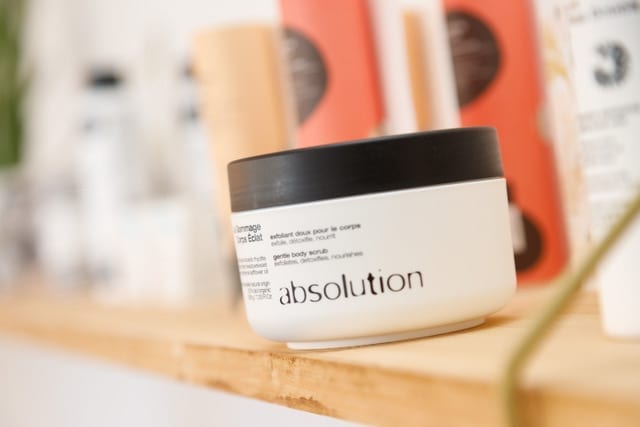 Relaxt hangt Irene op de comfortabele grijze loungebank in haar lichte, ruime Citywellness. Het frisse interieur straalt gezelligheid uit door de bloemen die ze op de balie en op de tafeltjes bij de hoekbank heeft gezet. Op de plank achter de balie staan de 100% natuurlijke, biologisch geteelde, ecologische en proefdiervrije producten van Absolution. Ze gebruikt dit merk bij de treatments.