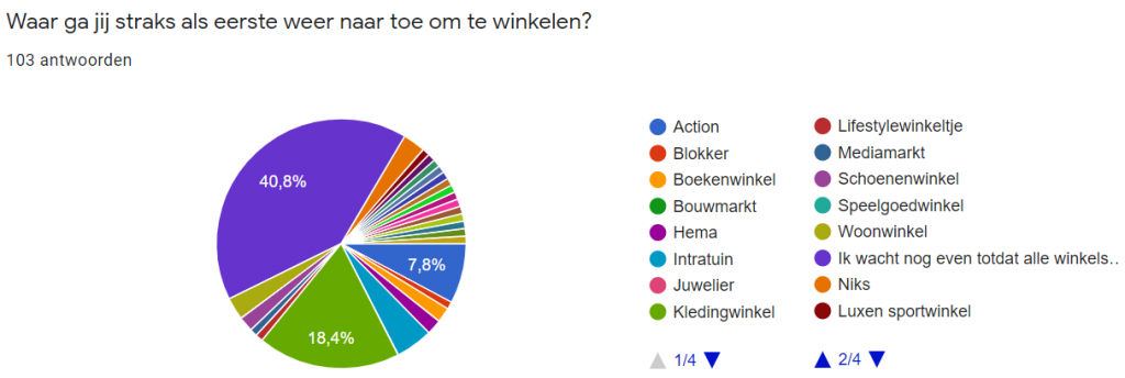 Er is in totaal zo'n honderd keer gestemd. De uitslag van de poll kan je bekijken in onderstaande afbeelding en het resultaat is duidelijk; de meeste mensen wachten liever nog even totdat alle winkels weer normaal open zijn. Dat winkelen op afspraak zien we blijkbaar toch niet zo zitten. Na deze groep van 40,8 procent staat een bezoekje aan een kledingswinkel op plaats twee met 18,4 procent gevolgd door de Action op plaats drie met 7,8 procent.