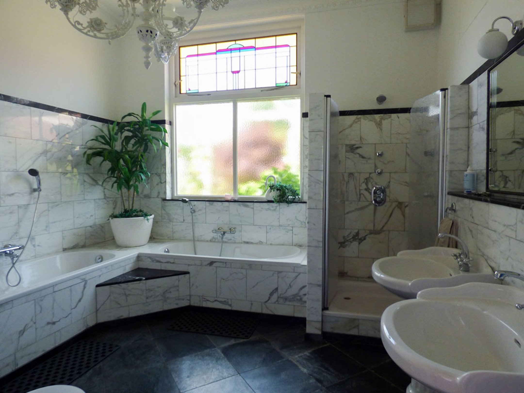 Een badkamer met veel marmer, glas in lood en.. 2 baden! Dat geeft zoveel mogelijkheden. Het lijkt ons de perfecte setting voor een potje zeeslag. Of heeft het een hygiënisch doel? Het eerste bad gebruik je om het vuil los te weken, het tweede bad is de finishing touch. Natuurlijk kun je ook lekker samen in bad gaan, maar dan wel ieder zijn eigen favo shampoo gebruiken.