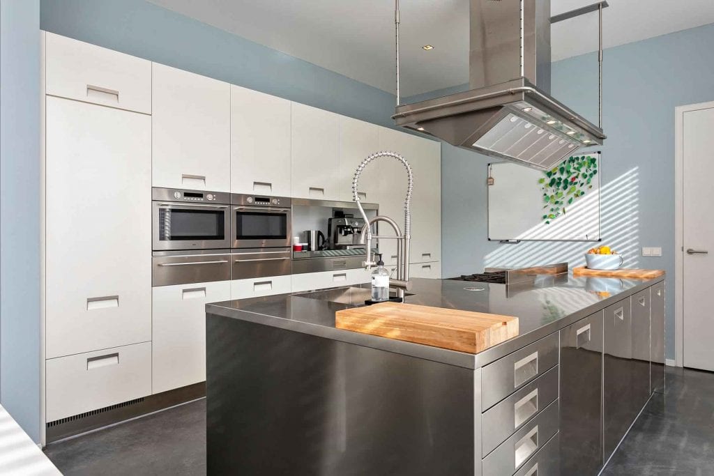 De keuken is uitgerust met een kookeiland en diverse inbouwapparatuur, wat de keuken zeer ruimtelijk maakt. Naast de functie als kookgedeelte, dient de keuken ook als eetkamer.